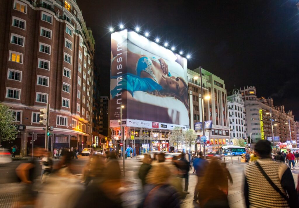 - Intimissimi utilise des dispositifs publicitaires dans des endroits stratégiques tels que Milan et Madrid pour maximiser la visibilité.